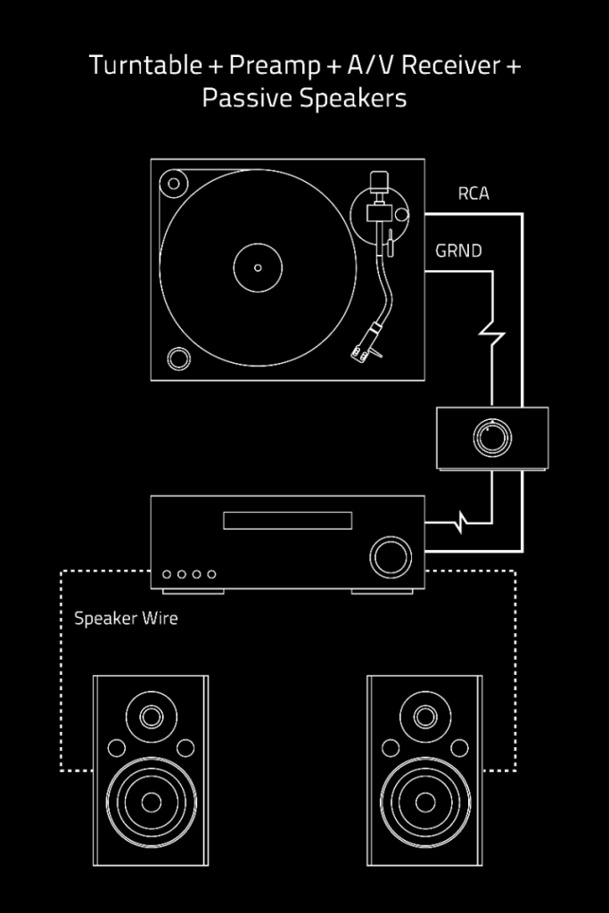• Some turntables have a built-in preamp (look for a “Line/Phono” switch). If your turntable has one, set it to “Line” if connecting directly to speakers.